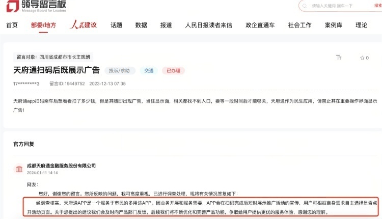 早在2023年便有网友在人民网领导留言板反映,使用成都天府通App扫码乘车后本想看看扣了多少钱,但是其随即出现广告,挡住显示界面,找不到入口,要等一段时间后才能够关。该用户直言,天府通作为民生应用,应禁止其在重要操作界面显示广告!