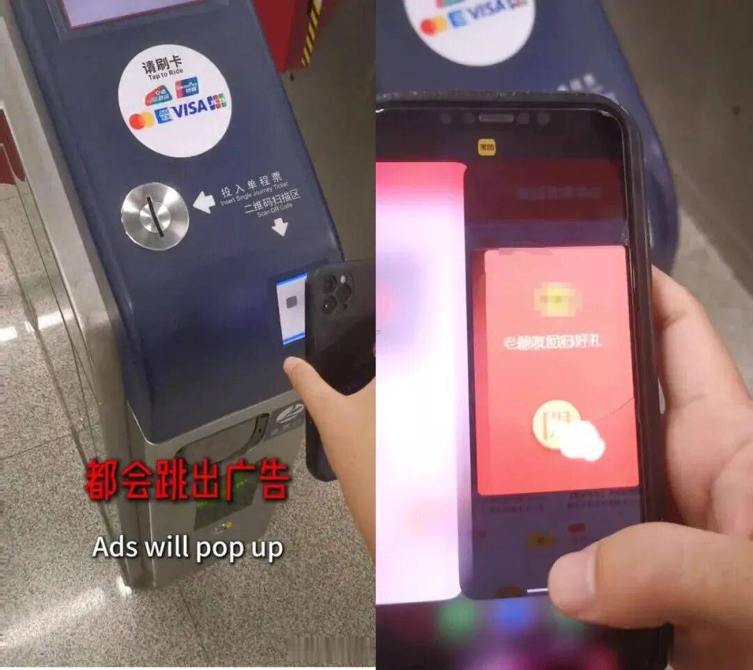 部分网友分享的视频显示,点击关闭广告后再扫描乘车码时,因手机倾斜再次触发跳转广告,如此反复难以扫码过闸。