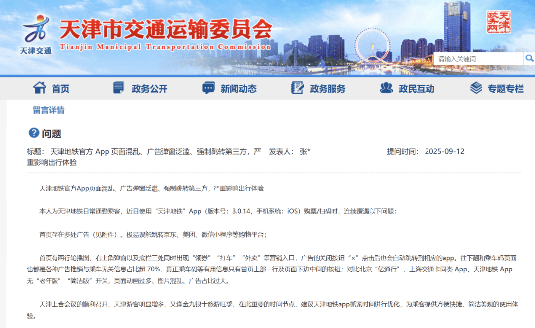 此外,天津地铁App也曾被用户反映存在广告弹窗泛滥、强制跳转第三方等问题,严重影响出行体验。用户指出,App首页广告占比过大,且极易误触跳转至购物平台,与乘车无关的信息占比超过70%。