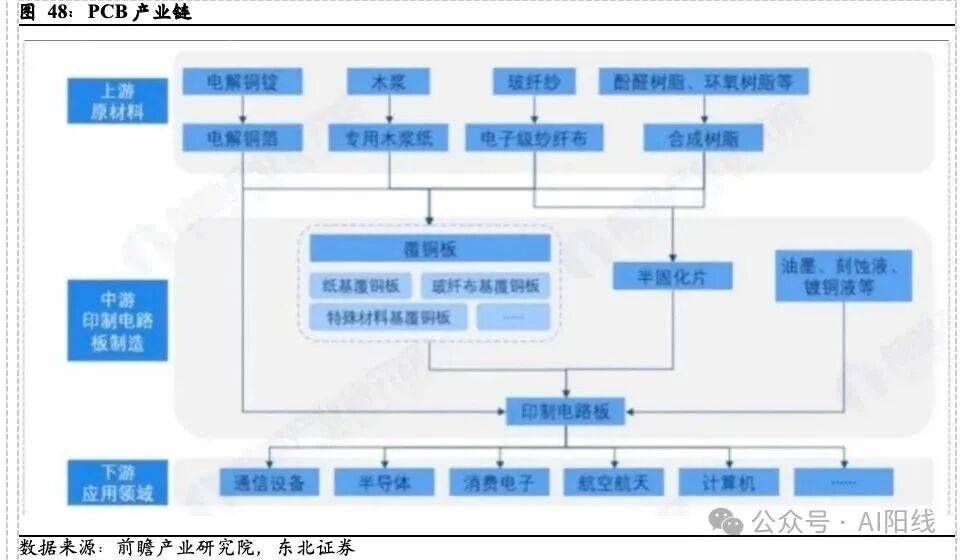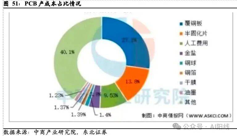 PCB高端化推动的上游CCL向高端化演进。随着AI大模型、数据中心和高性能网络设备的迅猛发展,算力硬件迎来高带宽、低延迟、强散热的新需求,PCB作为核心连接与传输平台,逐步迈向高频、高速、多层次的高端化方向。尤其在AI服务器主板、背板与高速光模块中,PCB被要求支持高速差分信号传输、控制串扰与信号反射,传统材料已难以胜任。在这一背景下,作为PCB核心材料的覆铜板(CCL)成为产业链向上传导的第一受益者,其介电性能、热稳定性与机械强度面临全方位升级。目前,高端AI服务器所用的背板PCB通常需具备20层以上的复杂叠层结构,这对CCL的介电常数(Dk)与介电损耗(Df)提出严苛要求。覆铜板作为PCB基材,决定整体结构性能。CCL是由绝缘基材(如环氧树脂玻璃纤维布)与上下铜箔压合而成,是PCB制造中最关键的原材料之一。从成本结构来看,CCL在PCB原材料中占比最高。中商情报网数据显示,覆铜板、半固化片、铜箔合计成本占比超过40%,其中CCL承担结构支撑、电气隔离与热传导三重任务,其性能直接决定PCB的信号完整性与系统可靠性。