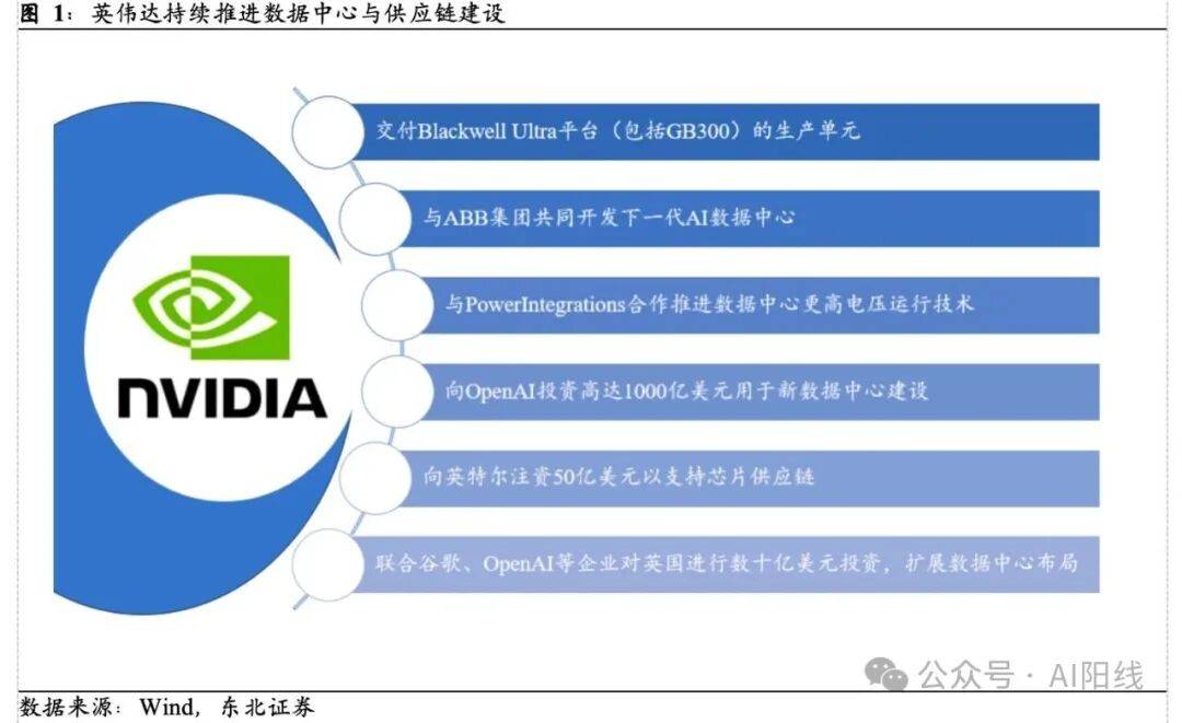 持续推进数据中心建设,增强供应链能力。英伟达积极构建和强化其全球供应链,以支持AI数据中心基础设施的快速发展。在供应链建设方面,公司于2026财年第二季度开始交付Blackwell Ultra平台(包括GB300)的生产单元,确保先进计算产品的持续推出。为应对美国政府规则变化,英伟达将扩大美国本土制造业务,投资专用设备和工艺,以提升供应链韧性和冗余能力,满足对AI基础设施日益增长的需求。同时,公司通过多项合作夯实供应链基础:与ABB集团共同开发下一代AI数据中心;与PowerIntegrations合作推进数据中心更高电压运行技术;向OpenAI投资高达1000亿美元用于新数据中心建设;向英特尔注资50亿美元以支持芯片供应链;并联合谷歌、OpenAI等企业对英国进行数十亿美元投资,扩展数据中心布局。这些举措全面强化了从硬件制造到能源管理的供应链体系,确保英伟达在开源模型和竞争环境中保持平台影响力。