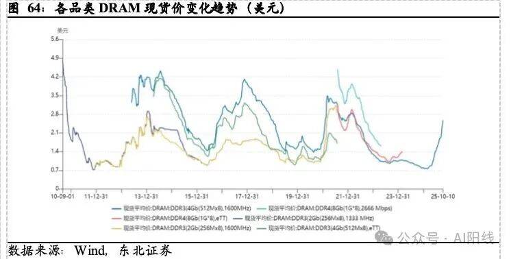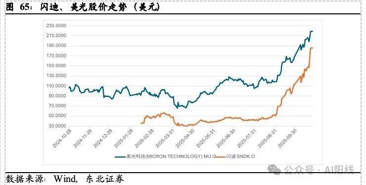 本轮上涨的驱动逻辑发生本质变化:AI服务器成为需求核心,其存储配置量为传统服务器的3-5倍,HBM因高带宽特性成为GPU标配。2024年HBM价格同比上涨80%,DDR5渗透率在服务器领域超85%。供给端,三星、美光等将产能转向HBM和DDR5,导致DDR4产能削减20%,价格倒挂现象显著(DDR4现货价较DDR5高出48%)。AI从训练向推理阶段扩展,推动企业级SSD需求增长50%以上。