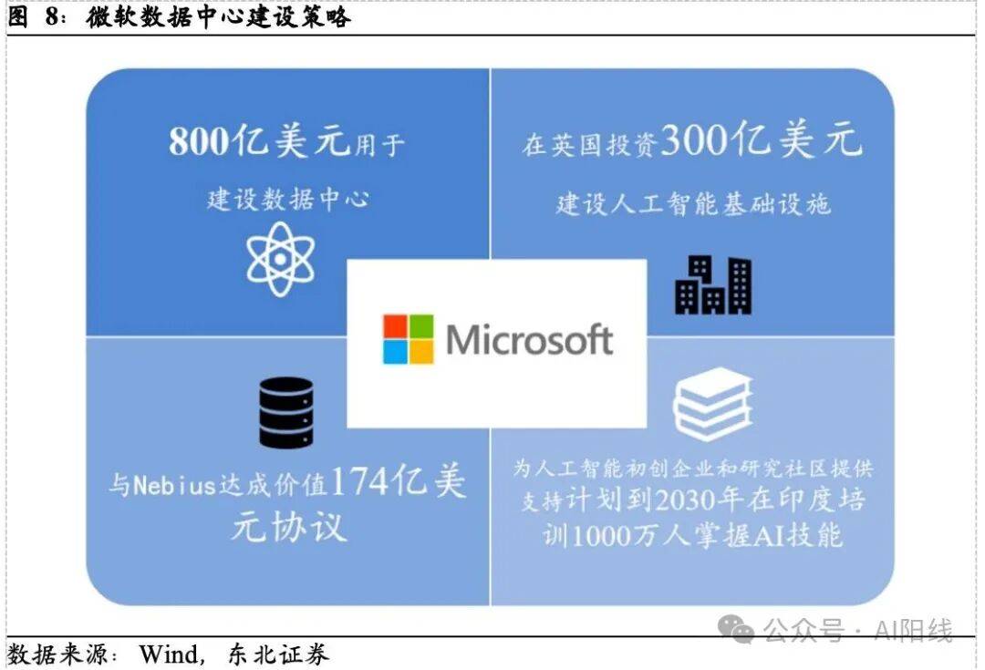 微软在2025年围绕投资建设数据中心展开投资策略。微软宣布计划在2025年斥资高达800亿美元用于建设数据中心,还表示将在未来四年内在英国投资300亿美元用于建设人工智能基础设施。公司与人工智能基础设施集团Nebius达成价值高达174亿美元的协议,后者将在五年内为微软的人工智能业务提供算力。此外在印度,微软额外投资用于开发可扩展的人工智能计算生态系统,为当地人工智能初创企业和研究社区提供支持,并计划到2030年在印度培训1000万人掌握AI技能。