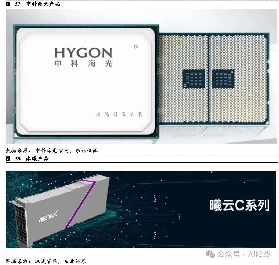CPU-GPU协同的计算方案,海光信息是x86架构的稳健派。海光信息的DCU(Deep Computing Unit)产品基于x86架构,在生态兼容性方面具有独特优势。深算二号(DCU-Z100)的单精度算力达90TFLOPS,半精度算力180TFLOPS,性能达到英伟达A100的80%-90%;战略动向方面,海光与中科曙光换股吸收合并,形成“芯片-服务器-云计算-算力服务”全产业链。下一代展望:海光信息最新的DCU产品为深算三号,其对标英伟达NVIDIA A100。 深算三号在双精度浮点算力(FP64)、单精度算力(FP32)等核心指标上已接近A100的80%,并支持主流AI大模型训练与推理,兼容类CUDA生态,适配LLaMA、GPT等模型。下一代追赶目标:NVIDIA H100。海光已明确将H100作为下一代DCU产品的性能追赶目标,并在软件栈、算力密度、能效比等方面持续优化,以缩小与国际顶尖产品的差距。