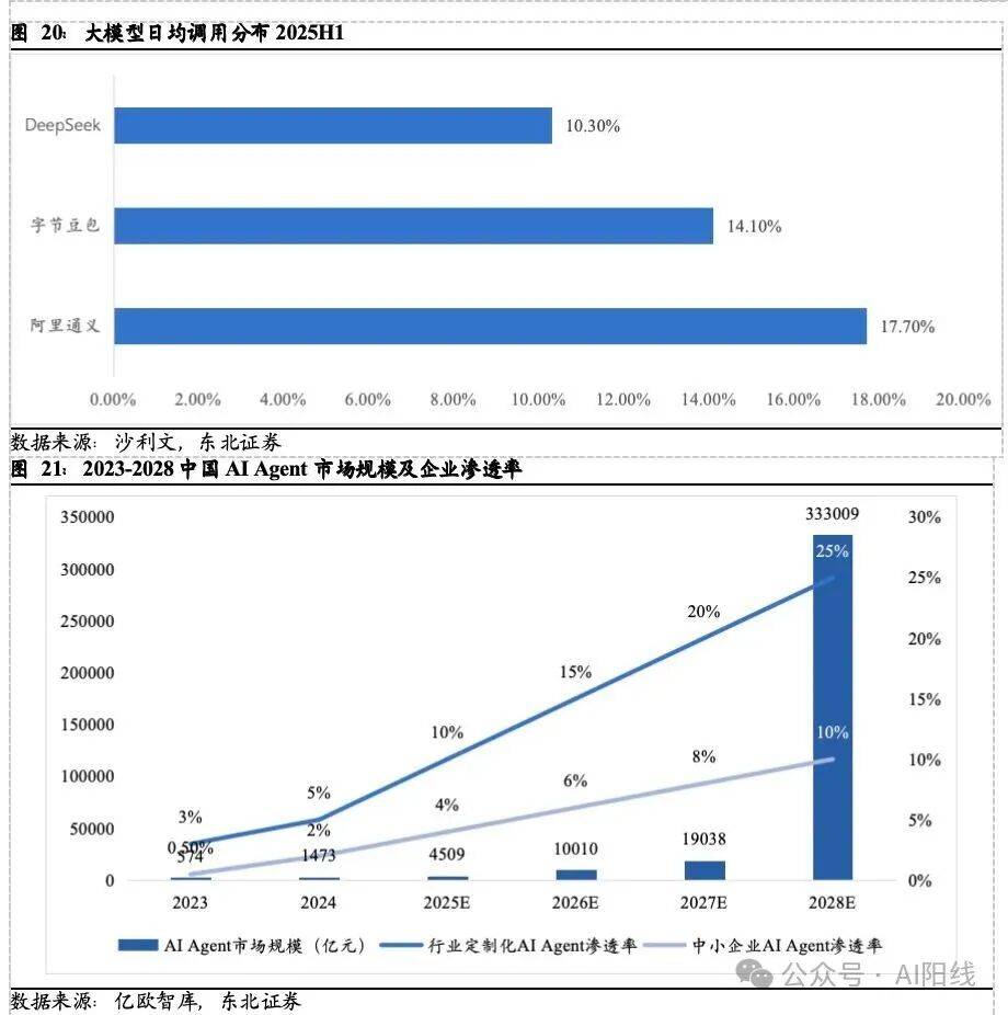 企业端大模型赋能生产力,国内Agent渗透率有望加速提升。根据亿欧智库数据,2024年中国AI Agent市场企业渗透率不足5%。但随着AI Agent价值扩大及企业端开发市场成熟,2028年中国AI Agent市场规模有望达到3.3万亿元。