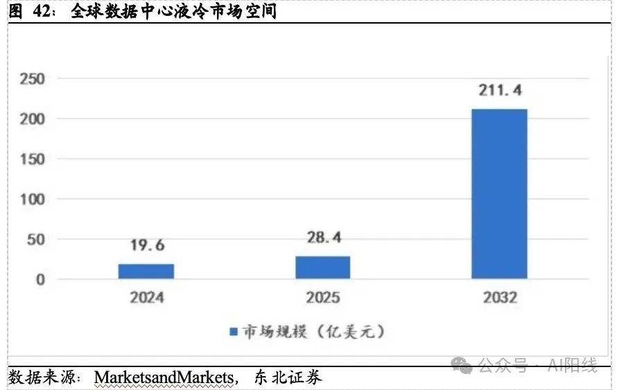 政策驱动与算力时代双轮推动液冷产业爆发。渗透率仍处早期,液冷有望迎来快速放量增长。根据TrendForce预测,2025年液冷在全球数据中心的渗透率将从2024年的10%增长至20%以上,虽然风冷在存量市场仍占主导地位,但在算力需求提升、节能减排的社会目标下,液冷正在成为芯片/机架级冷却的主流解决方案。根据北京科智咨询公司和中国信通院联合发布的《中国液冷数据中心市场深度研究报告》数据显示,近年来,中国液冷数据中心市场快速发展,2019-2022年年复合增长率达到39.7%。2022年,液冷数据中心市场规模达到100.5亿元,同比增长47.2%。预计在2023-2027年期间,中国液冷数据中心市场将以59%的复合增长率持续蓬勃发展。2027年液冷数据中心的整体市场规模预计将达到1020亿元。根据MarketsandMarkets数据,2024年全球数据中心液冷市场空间约19.6亿美元(约合人民币140.7亿元),预计2025年全球数据中心液冷市场有望达28.4亿美元(约合人民币203.9亿元)、同比高增44.9%,并预计至2032年液冷市场规模有望提升至211.4亿美元(约合人民币1517.7亿元),2025-2032CAGR33.2%。我们认为液冷市场主要的驱动来自AI、云计算、高性能计算发展,带动高密度算力计算需求,驱动数据中心转向散热效率更高的液冷方案。