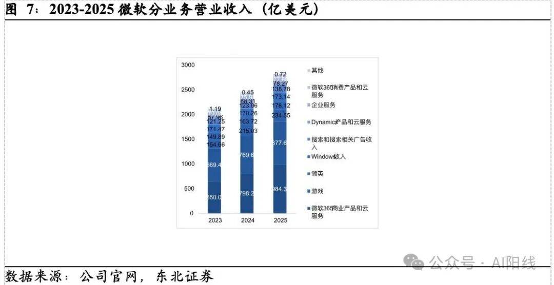 AI驱动云业务增长,AI技术投入正循环。据微软2026财年Q1报告,其云业务整体收入达491亿美元,同比增长 26%,按固定汇率计算增长25%;商业未履行合同额大幅增长51%,达到3920亿美元。分业务来看,智能云业务增长 28%,其中Azure和其他云服务收入增长40%,远超生产力与业务流程收入(17%)及个性化计算业务收入(4%)。