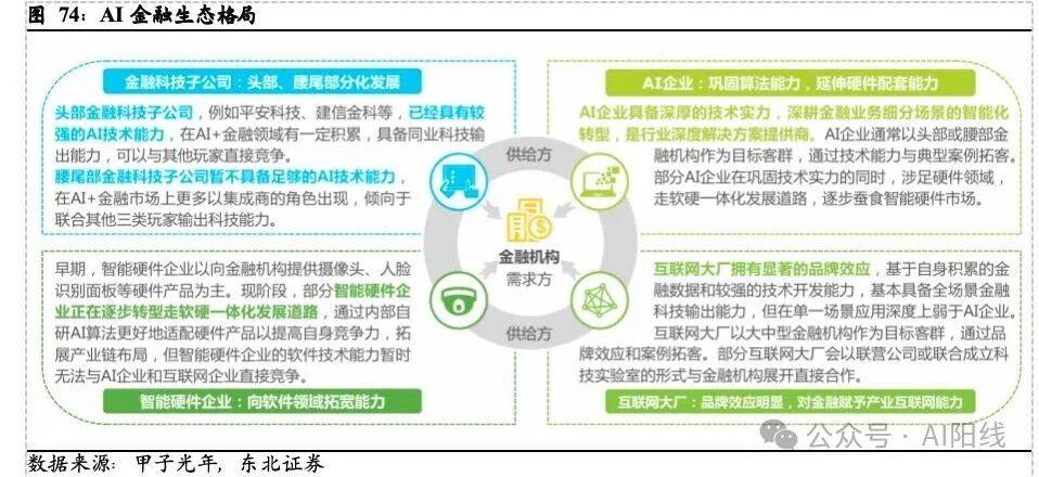 在AI+金融市场,作为需求主体的金融机构拥有更多话语权,一个金融科技采购项目通常会有多个供给侧玩家参与其中。 AI+金融市场供给侧玩家可分为金融科技子公司、AI企业、智能硬件企业、互联网大厂四类。在面对中小金融机构客群时, 四类玩家呈竞争关系,大量中小金融机构并未成立自己的科技子公司,但机构间业务竞争激烈,为避免业务竞争中落伍, 更倾向于外购AI产品和解决方案;在面对头部金融机构客群时,由于金融科技子公司的独特地位与资源优势,其他三类玩 家更倾向于联合金融科技子公司拓客,此时竞争主要在其他三类玩家之间展开。