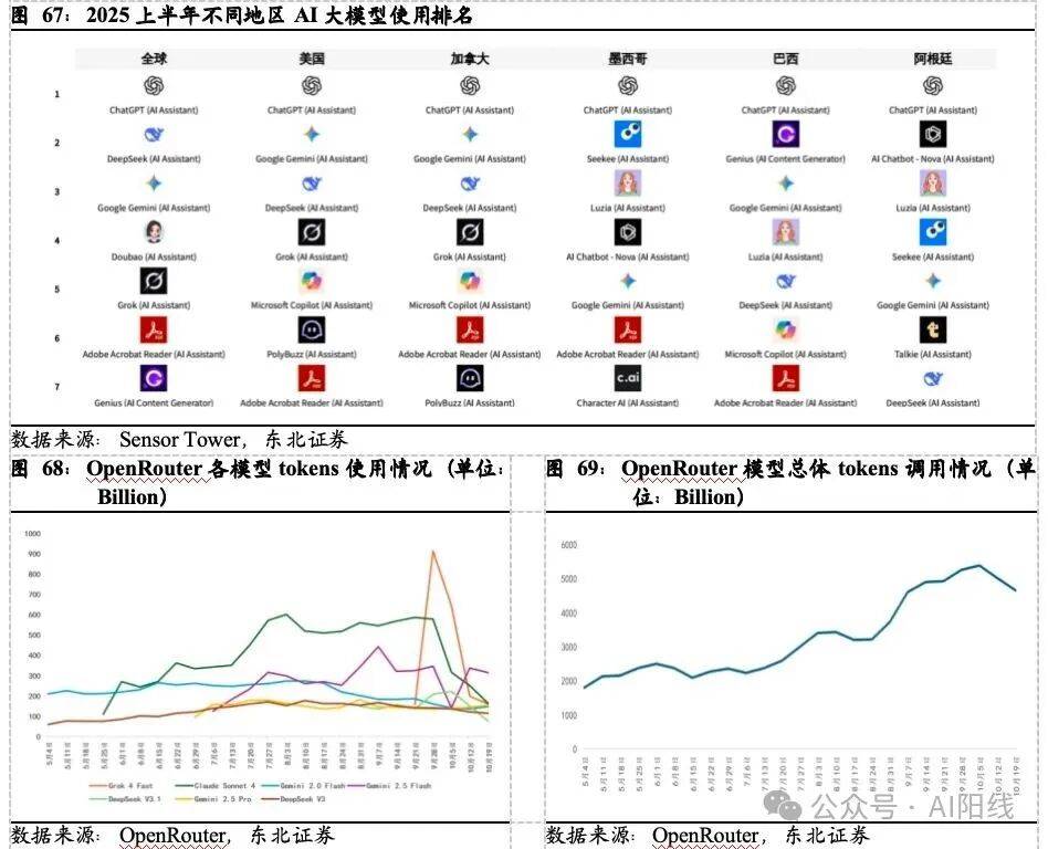 在竞争日益激烈的市场中, DeepSeek于2025年1月强势发布,凭借更低的资源需求媲美顶尖AI模型。与此同时,Grok和Meta等新兴AI应用也表现出色,这表明自ChatGPT 和Nova等早期应用问世以来,市场对 AI 聊天机器人的需求在短短几年内已大幅扩张。截至 2025 年 6 月底, ChatGPT 以 9.4 亿次 的累计下载量稳居榜首, Google Gemini 和 DeepSeek 则分别以 2 亿和 1.27 亿次的累计下载量 位列其后。我们认为,AI大模型的调用情况预示着未来AI应用的崛起,建议重点关注:AI+医疗、AI+金融、AI+教育。