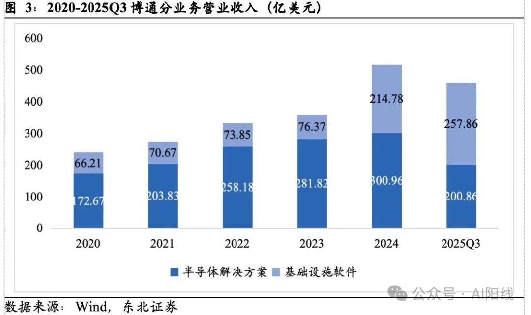 受益市场需求,AI浪潮推动营收毛利双增长。公司的财务业绩表现强劲。2025Q3半导体及相关产品营业收入达257.86亿美元,基础设施产品收入达200.86亿美元,主要得益于市场对网络产品,尤其是定制化人工智能加速器和AI网络解决方案的强劲需求。与此同时,基础设施软件部门收入由VMware Cloud Foundation(VCF)产品驱动增长。半导体与基础设施软件需求驱动下,公司毛利率显著提升。