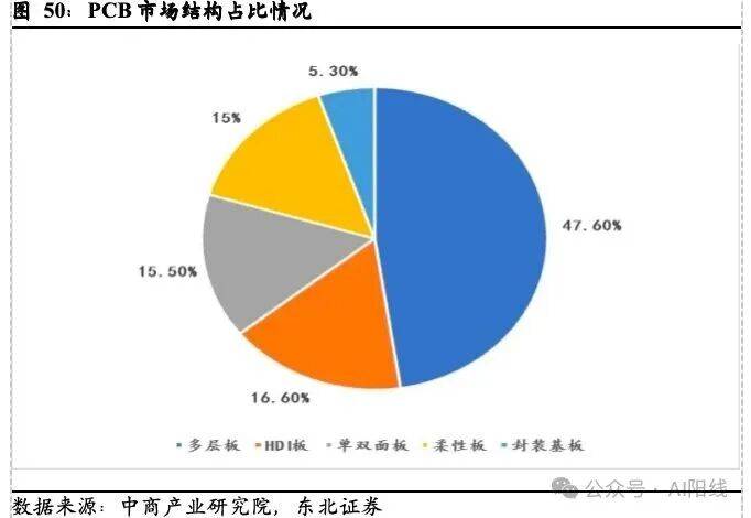 从技术维度看,AI服务器与分布式算力集群对PCB提出了更高的层数与布线密度要求,多层板、HDI板、背板及先进封装基板成为高端PCB的重要组成。当前,我国多层板在PCB产值结构中占比已超过40%,HDI板占比约16.6%,且在高算力场景下,先进封装基板如ABF载板等新型高端PCB应用正加速渗透。