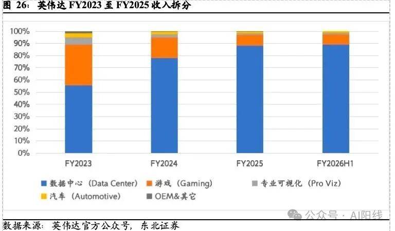 从游戏显卡之王到AI计算巨头。FY2023是历史性的分水岭,英伟达数据中心收入(150亿美元)首次超越游戏业务(91亿美元),正式“加冕为王”。到了FY2025,数据中心占比已高达88.3%,公司彻底完成了从“游戏公司”到“AI公司”的蜕变。通过拆解其收入来源。按市场平台划分,我们可以清晰地看到从FY2023到FY2025数据中心占比的显著提升。
