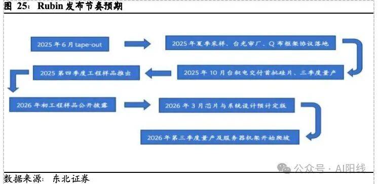 三倍算力提升,Rubin发布进展顺利。Rubin单芯片推理算力达50 petaflops(FP4精度),较Blackwell Ultra性能提升3.3倍,该架构将采用288GB HBM4高带宽内存(8层堆叠),带宽13TB/s;Ultra版将升级至1TB HBM4e,与Vera CPU架构组成超级芯片系统。Rubin GPU和Vera CPU正在台积电先进的3nm N3P节点上生产,并采用CoWoS-L(带本地互连的晶圆上芯片)封装技术。互联技术采用第六代NVLink,带宽3.6TB/s,支持CPU-GPU异构集成(Vera CPU + Rubin GPU)。能效1200W TDP,液冷散热渗透率超90%。这种组合实现了超高密度计算封装,并显著提升了能效和互连性能。Rubin发布节奏预期为2025年6月tape-out,2025年夏季采样,台光7月审厂,8月Q布框架性协议逐步落地,首批硅片预计10月由台积电交付,2025年第三季度量产,工程样品计划于2025第四季度推出,2026年初公开披露,芯片与系统设计预计2026年3月定版,2026年第三季度量产及服务器机架开始爬坡。