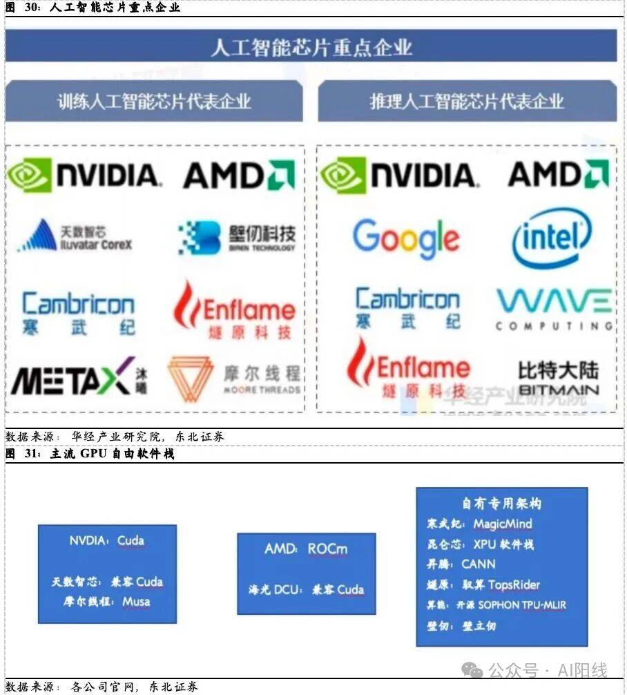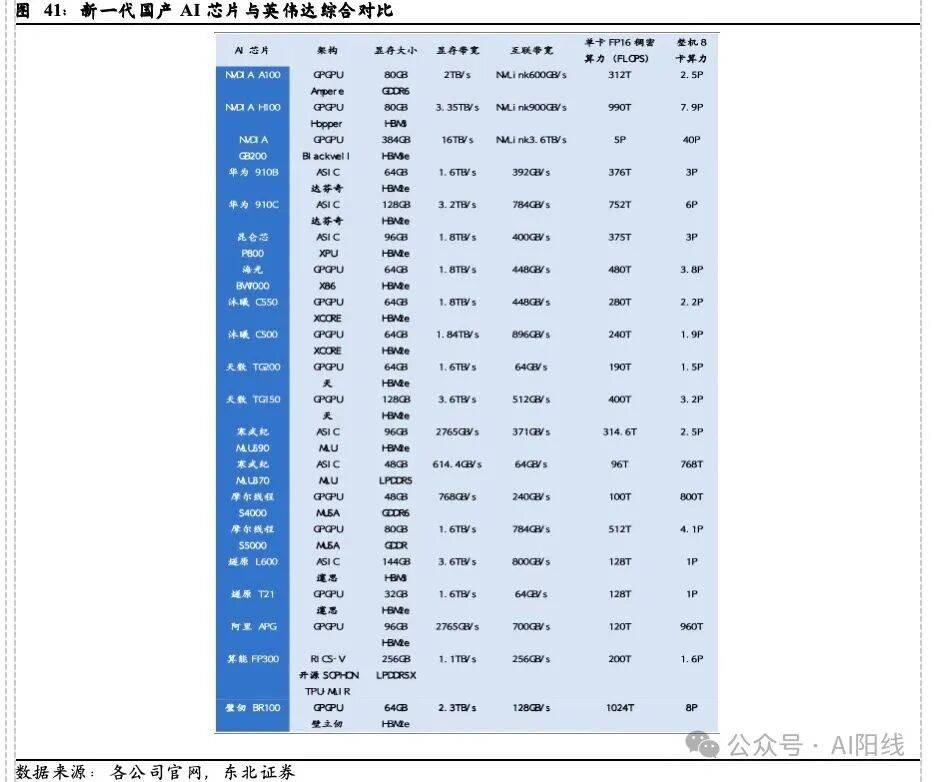 在硬件性能方面,国产AI芯片与英伟达的差距正在快速缩小,但在某些关键指标上仍存在一定差距。在高端训练芯片领域,英伟达H100仍然保持领先地位;推理芯片性能对比。在推理场景下,国产芯片的表现更加出色。实际应用性能表现中,单纯的理论性能并不能完全反映芯片的实际表现,在实际应用中,软件优化、系统设计等因素同样重要。根据多家机构的测试,在特定应用场景下,国产芯片的实际性能表现令人惊喜。我们认为AI芯片产业的发展离不开整个产业链的协同,从上游的设计工具、制造设备,到下游的应用开发、系统集成,每个环节都至关重要。
