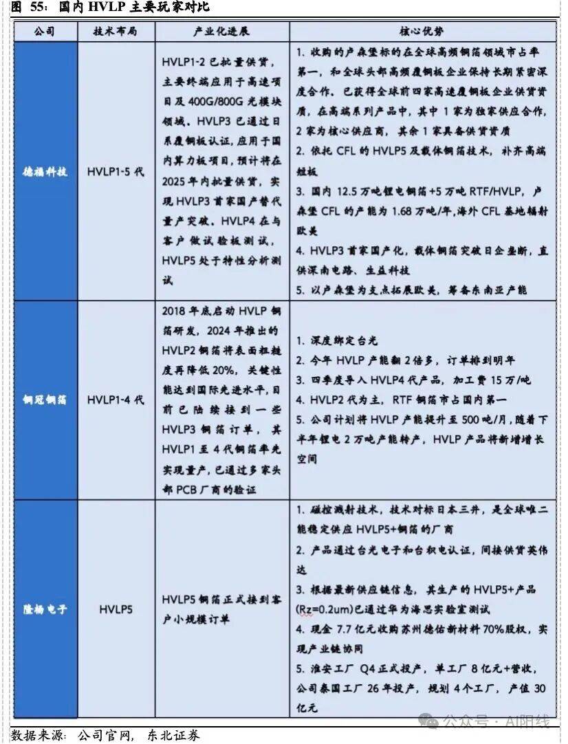 国产HVLP铜箔构成最大预期差,放量验证有望驱动业绩与估值重估。国产HVLP铜箔受限于技术壁垒与验证周期,仍处于放量前夜,是整个PCB高端材料链条中最大的预期差所在。在CCL厂商高性能化需求牵引下,国内铜箔龙头企业正加快技术研发与客户导入节奏,力图打破海外厂商在高端铜箔领域的垄断地位。