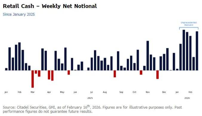 Rubner周二在给客户的报告中写道:“我们平台上的净名义金额已达到前所未有的水平。购买活动的规模、持续时间和广度都显著超过了之前的峰值,凸显了散户在2026年初作为新增需求主要来源的作用。”