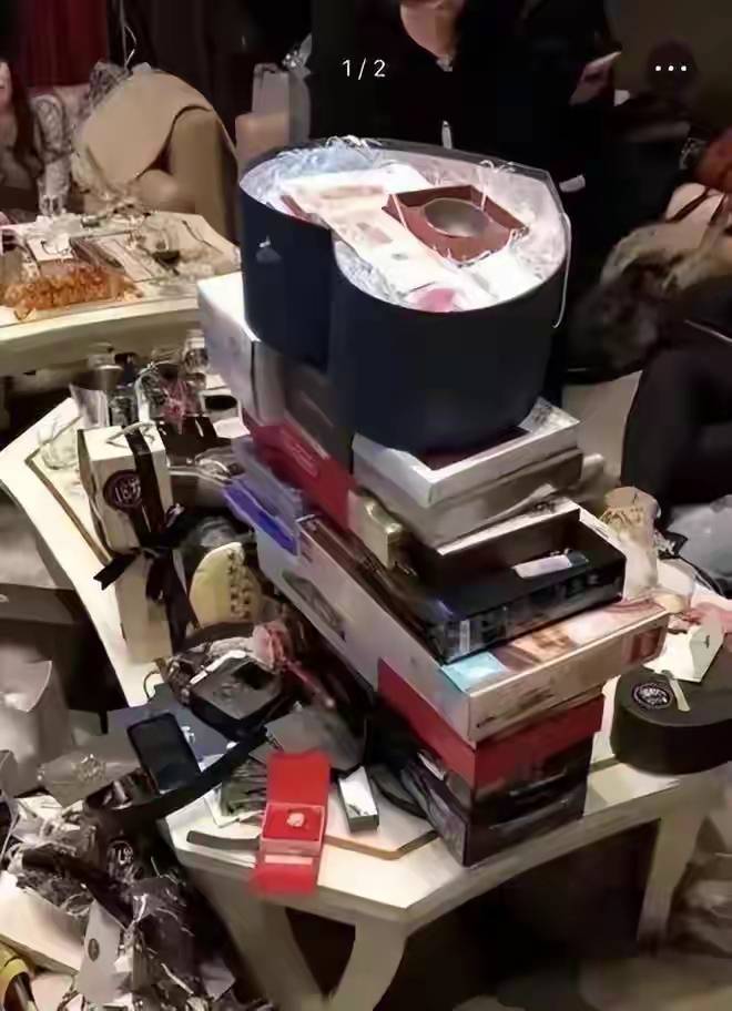 现场照片里,礼物堆积如山,会所还特意布置了场地,用玫瑰铺成红毯,场面十分张扬。