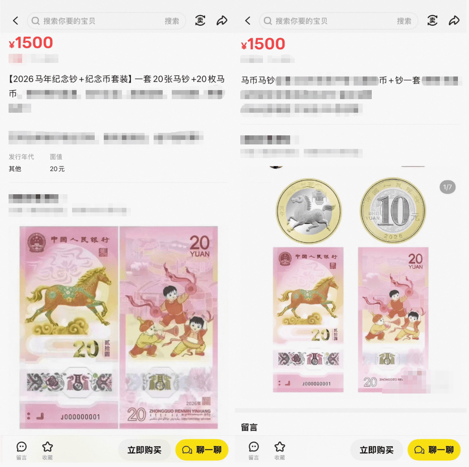 在某交易平台上,一套马年币钞的报价普遍超过1000元,甚至高达1500元,较面值翻倍。